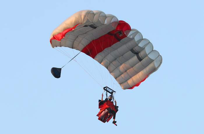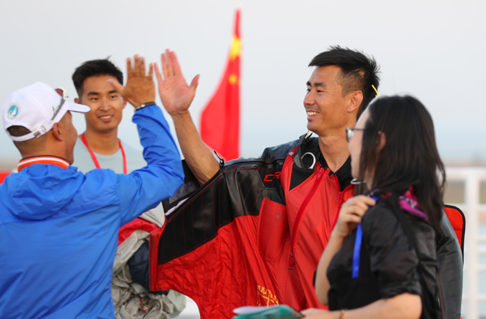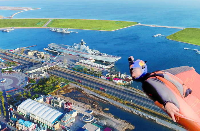 活动现场,“亚洲翼装飞行第一人”张树鹏作为特邀嘉宾,在天津泰达航母主题公园“基辅号”航母甲板,进行了“哪吒闹海”——全球首次航母翼装飞行挑战,“飞人”张树鹏随《大美天津》直升飞机从“基辅号”航母舰下出征,升空至3000米鸟瞰大海,并于1500米高度起跳,由海上向航母进行翼装飞行,飞越航母主体后,他打开降落伞,在万众瞩目中成功完成了航母甲板指定落点的降落,整个挑战过程一气呵成、毫厘不差!