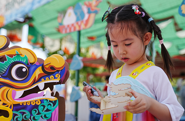 节日期间,游客除了领略“航母编队”强大阵容,观看《汽车特技》王牌演出之外,为营造浓厚的节日氛围,泰达航母特推出“粽香情•航母韵”端午主题民俗活动,由津门非遗文化传承人和民间艺人现场制作手工食玩作品,包括捏泥人、做香包、画糖人、包粽子等,还推出指尖赛龙舟、涂鸦画端午、投壶等活动,吸引众多游客前来互动参与,感受传统民俗乐趣。