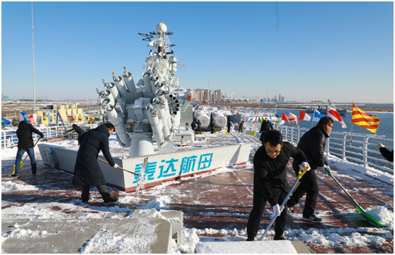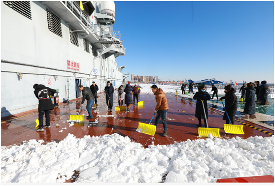 2020年12月13日迎来立冬以来第一场大雪。虽然泰达航母因设备检修仍在闭园期间,但雪情就是无声的集结号,泰达航母广大党员干部职工快速反应,积极应对,自上午8时起持续开展清雪除冰工作,共投入40余人次,投入铁锹、扫把、推雪板,扫雪工具50余具。目前景区主要道路、航母甲板积雪已清理干净,为全面落实疫情防控工作及园区安全巡检提供坚实的保障。