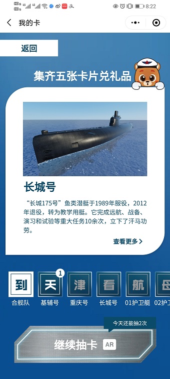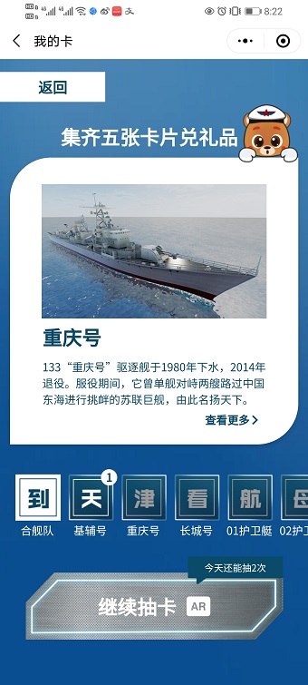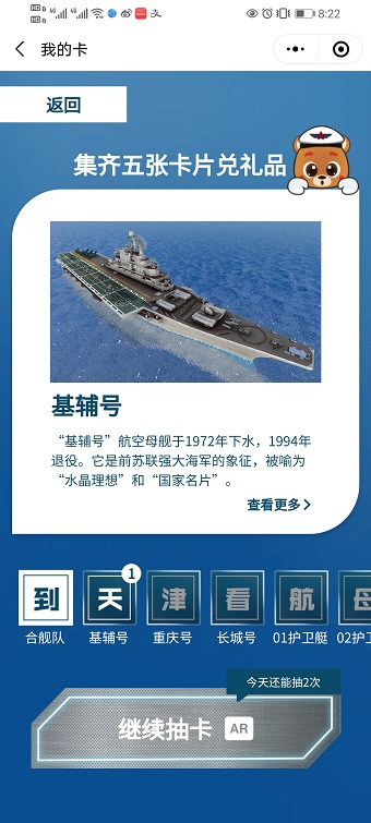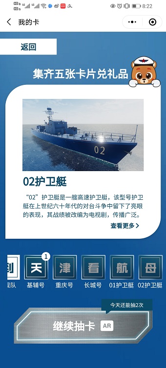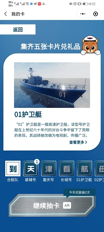 AR线上体验小程序已经上线泰达航母主题公园微信公众号,点击菜单栏“航母AR”选择“集舰有礼”即可进入集舰卡小程序,通过扫描本人身份证(国徽面),就能看到舰艇的AR模型,更能获得舰艇卡,集齐“航母编队”舰艇卡即可获得抽奖机会,欢迎大家参与体验!